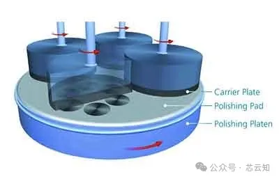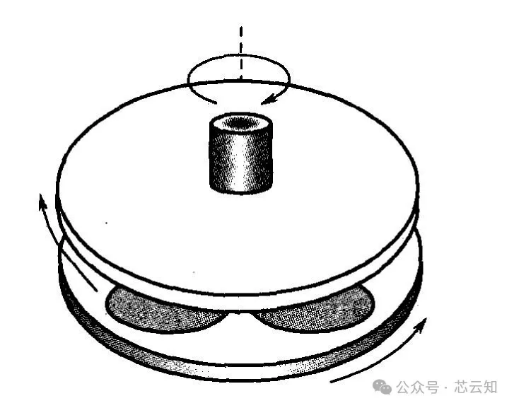 5)磨片切片完成后,对于硅片表面要进行研磨机械加工,其示意图如图5。磨片工艺的目的包括以下两点:一是去除硅片表面的刀疤,使硅片表面加工损伤均匀一致。二是调节硅片厚度,使片与片之间厚度差逐渐缩小,并提高表面平整度和平行度。