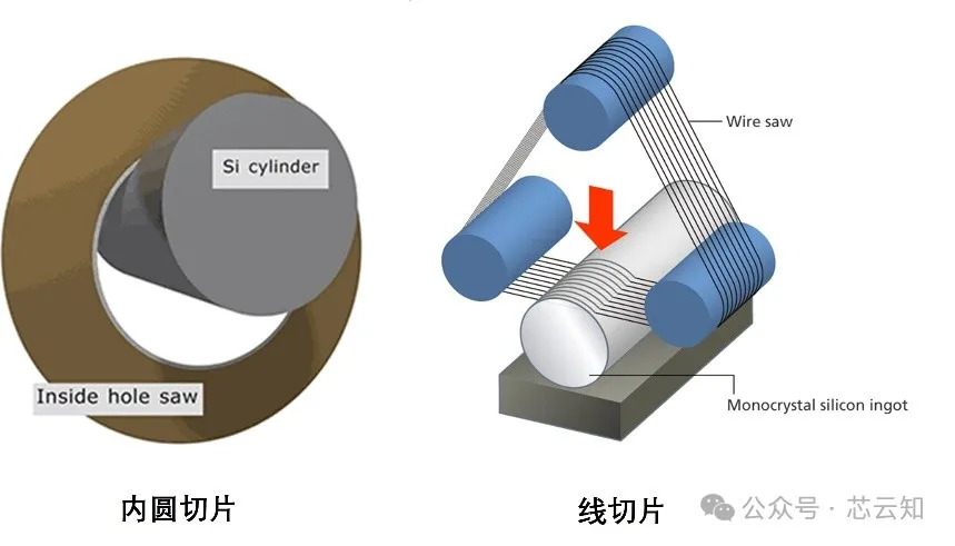 4)切片晶棒的外形处理完之后接着将硅棒切为硅片,切片目前有两种方式,一是用有金刚石涂层的内圆刀片把晶圆从晶体上切下来。这些刀片是中心有圆孔的薄圆钢片。二是线切片,通过粘有金刚石颗粒的金属丝的运动来达到切片的目的。单晶硅在切片时,硅片的厚度、晶向、翘曲度和平行度是关键参数,需要严格控制。晶片切片的要求是: 厚度符合要求,平整度和弯曲度要小,无缺损,无裂缝,刀痕浅。两种方法示意图如图所示。