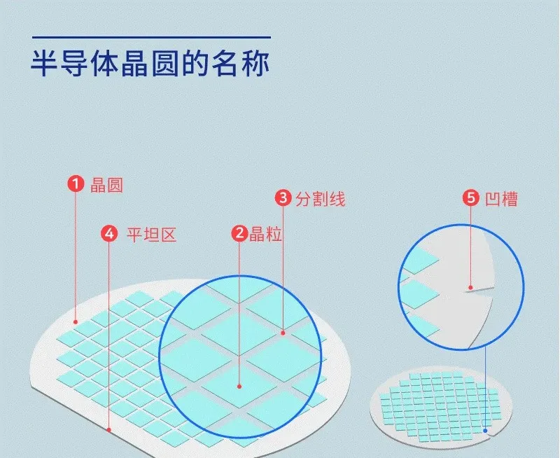 1.晶圆(Wafer):晶圆是半导体集成电路的核心材料,是一种圆形的板。2.晶粒(Die):很多四边形都聚集在圆形晶圆上。这些四边形都是集成电子电路的 IC 芯片。3.分割线(Scribe Line):看上去各个晶粒像是粘在一起,但实际上晶粒和晶粒之间具有一定的间隙。该间距称为分割线。在晶粒和晶粒之间设置分割线的是为了在晶圆加工完成后将这些晶粒一个个割断,然后组装成芯片,也是为了留出用金刚石锯切割的空间。4.平坦区(Flat Zone):平坦区是为区分晶圆结构而创建的区域,是晶圆加工的标准线。由于晶圆的晶体结构非常精细并且无法用肉眼判断,因此以这个平坦区为标准来判断晶圆的垂直和水平。5.凹槽(Notch):如今也出现了具有凹槽的晶圆。和平坦区晶圆相比,凹槽晶圆可以制造更多的晶粒,因此效率很高。半导体产业包括生产晶圆的晶圆产业以及以晶圆为材料设计和制造的晶圆加工产业——制造行业(Fabrication,FAB)。另外,还有组装产业,它将加工过的晶圆切割成晶粒,并包装好以防止受潮或受压。